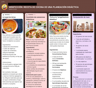 En el Padlet 2 redactaron cómo hacer una planeación didáctica con el formato de una receta de cocina. Los ejemplos de este prototipo textual no se encuentran publicados porque el docente mostró un trabajo que se había hecho en otra materia de otra carrera, según comentó en la entrevista (Figura 2).