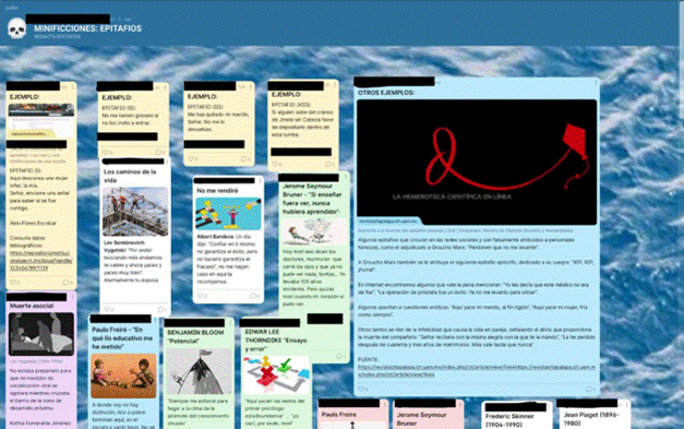 En el Padlet 4 el alumnado escribió un epitafio, a propósito del 2 de noviembre, día de los muertos. Para este ejercicio el docente elaboró una lista de teóricos de la educación y solicitó al estudiantado que investigaran diez datos biográficos y las aportaciones teóricas de cada uno, además de localizar ejemplos de epitafios para que identificaran con mayor facilidad su forma de escritura. Con esa información los alumnos tendrían insumos suficientes para redactar una minificción que cumpliera con este prototipo textual (Figura 4).