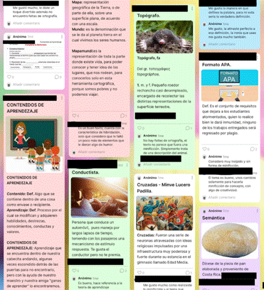 Además se pueden agregar imágenes y cambiar de color las notas, lo cual contribuye a que sea más atractivo el uso de la plataforma. Por lo anterior, para el profesor es más fácil leer los ejercicios de los y las estudiantes que en un documento de Word, y afirma que lo motiva más hacerlo de esa manera porque la presentación es diferente. “Es muy bonito leer en Padlet ese tipo de ejercicios breves, de escritura breve”. Incluso coloca imágenes que estén libres de derechos de autor o usa las opciones que ofrece la misma plataforma. También agrega un tema alusivo y da de uno a tres ejemplos. Por ello, tanto alumnos como docentes hacen uso de la creatividad que permite desarrollar la interfaz de manera visual y no solo se aplica al texto.