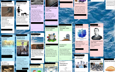 Las recurrencias en este Padlet fueron la vinculación de conceptos o nociones de las teorías con el nombre del autor de manera irónica y humorística, así como la relación de la vida del autor: su nacionalidad, su reconocimiento como teórico y su situación conyugal. Los autores trabajados y algunas participaciones en las que se mencionan fueron los siguientes: Vigotsky (Ventana 6, Ventana 9, Ventana 23), Bandura (Ventana 7, Ventana 26), Bruner (Ventana 8, Ventana 14, Ventana 17, Ventana 30), Freire (Ventana 10, Ventana 13, Ventana 18, Ventana 31), Bloom (Ventana 11, Ventana 24), Thorndike (Ventana 12, Ventana 25, Ventana 29), Skinner (Ventana 15, Ventana 19, Ventana 21, Ventana 28) y Piaget (Ventana 16, Ventana 20, Ventana 22).