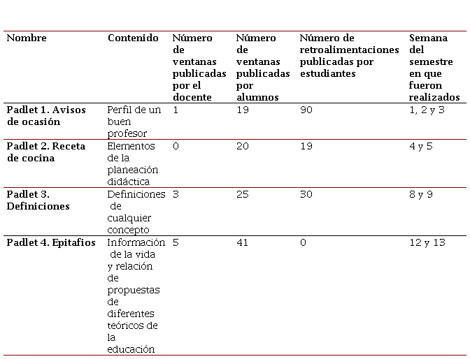 Para analizar las participaciones de los y las estudiantes, los insumos considerados fueron cuatro Padlets creados en diferentes momentos del semestre, cuya duración es de 16 semanas. Este material fue nombrado según el prototipo textual usado y se analizaron todas las ventanas publicadas por los alumnos, las alumnas y el docente, así como las retroalimentaciones realizadas por el estudiantado en esta pizarra colaborativa, datos que se exponen en la Tabla 1.