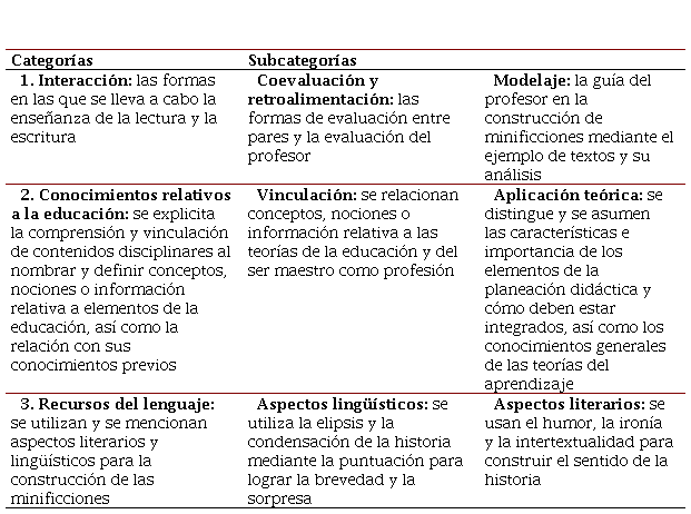 Esas habilidades relacionadas con el lenguaje se mostraron en la aplicación de los conocimientos previos asociados a prototipos textuales, a teorías del aprendizaje, a los elementos que componen una planeación didáctica y a los aspectos literarios que conforman una minificción, por lo que la estrategia didáctica del profesor fungió como una práctica innovadora que tuvo efectos positivos en la participación activa de los estudiantes en el proceso de redacción de minificciones.