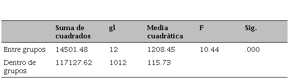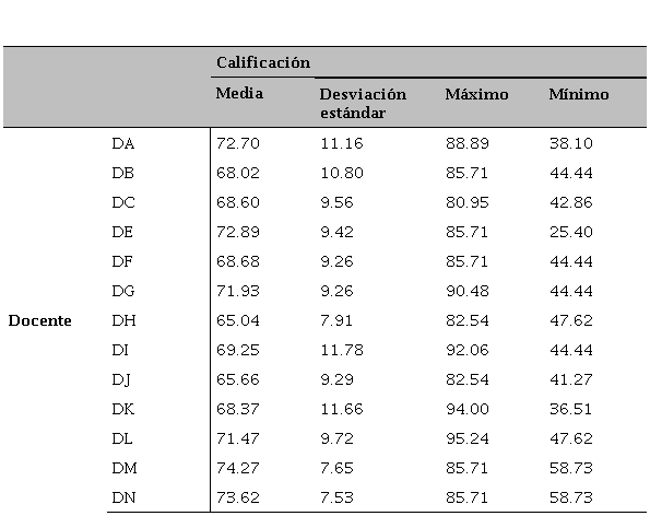 Continuando con los resultados, el análisis Anova permitió comparar entre profesores los resultados de rendimiento obtenidos por sus estudiantes, lo anterior sin aplicar ningún criterio particular asociado a los docentes que hiciera distinción entre los mismos. Parte de los principios que giran en torno a las pruebas estandarizadas establece el hecho de que los contenidos temáticos incluidos en la prueba deben ser iguales independientemente del profesor que imparta la clase, ya que la prueba tiene como eje rector la carta descriptiva que a su vez rige los contenidos que el docente trabaja durante el semestre. Sin embargo, los análisis estadísticos evidenciaron diferencias significativas (p = 0.000) en los resultados obtenidos por los estudiantes en el examen en razón del docente que impartió la asignatura (ver Tabla 2), estas variaciones van desde una media de 65.04 en la calificación del rendimiento en la prueba hasta un 74.27, este comportamiento se observa en la Tabla 3.