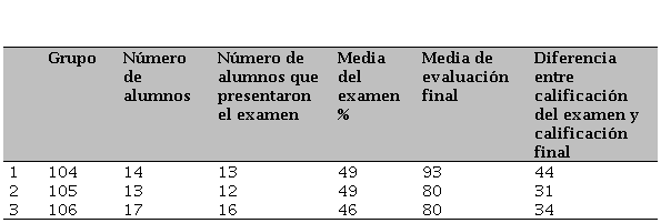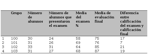 Realizando un análisis comparativo entre el rendimiento obtenido en la prueba estandarizada departamental y el rendimiento en la asignatura como resultado final del curso (actas de evaluación final) se observó un índice de homogeneidad con un promedio de 16 puntos de diferencia, con excepción de un grupo cuya diferencia entre un rendimiento y otro fue solo de 7 puntos. En la mayoría de los grupos no todos los alumnos presentaron el examen, lo anterior se puede observar en la Tabla 4.