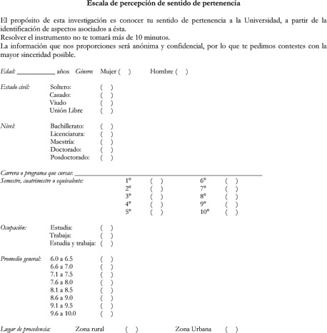 | Sentido de pertenencia | Edad | Género | Estado civil | Nivel educativo | Semestre que cursa | Ocupación | Promedio de Calificaciones | Lugar de Procedencia | |||