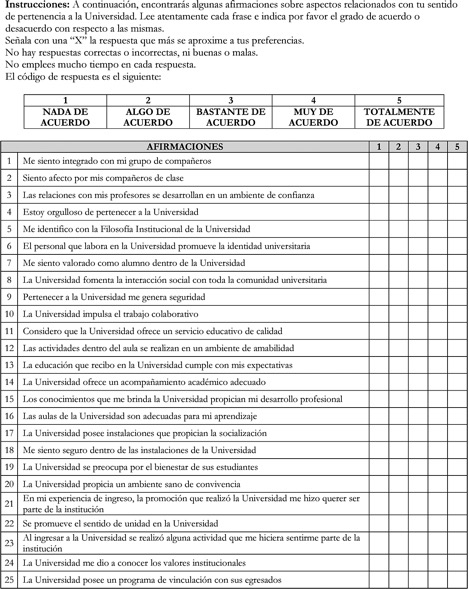 De acuerdo con Brea (2014), Corona (2020) y Roque y Quizhpi (2022), el estudio del sentido de pertenencia desde el ámbito académico puede hacerse considerando las dimensiones afectivas, sociales, académicas y del entorno. Al respecto es que se desarrolló la escala de percepción de sentido de pertenencia –PSP–, conformada por 25 ítems, cuyas respuestas se presentan en una escala Likert con un rango de valores de 1 a 5, donde 1 corresponde a “nada de acuerdo”, 2 “algo de acuerdo”, 3 “bastante de acuerdo”, 4 “muy de acuerdo” y 5 “totalmente de acuerdo” (ver Anexo). En la Tabla 1 se muestran las dimensiones que la conforman la escala y los reactivos correspondientes.