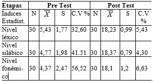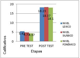 Los promedios alcanzados por los niños y niñas en el nivel Silábico etapa Pre Test fueron de 4,77 mientras que en el Post Test es de 18,37. Los promedios alcanzados por los niños y niñas en el nivel Fonémico etapa Pre Test fue de 4,37 mientras que en el Post Test es de 18,1