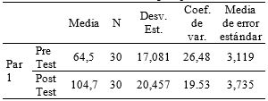 En la tabla 1 se presenta la estadística descriptiva del rendimiento de los trabajadores de la Municipalidad Provincial de Chiclayo, donde se observa que el rendimiento laboral promedio antes de aplicado el Plan de Desarrollo de Capacitación en Seguridad y Salud Ocupacional fue 64.50 aumentando este promedio a 104.70, después de aplicado Plan de Desarrollo de Capacitación en Seguridad y Salud Ocupacional.