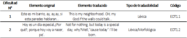 Los elementos intraducibles tienen opción a la adaptación según la escala de gradación de niveles de dificultad de Vinay y Darbelnet (1965).