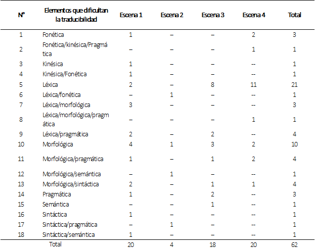 En la escena 1 los elementos que dificultan la traducibilidad son morfológica con 4 puntuaciones, léxico/morfológico con 3 puntuaciones y con 2 puntuaciones están: léxica, léxica/pragmática y morfológica/sintáctica.