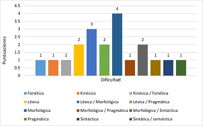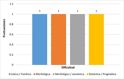 En la escena dos los elementos que dificultan la traducibilidad son cuatro y cada uno con una puntuación y son: Léxica/fonética, morfológica, morfológica/semántica y sintáctica/pragmática.