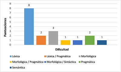 Léxico: cuando la dificultad de la traducción ocurre a nivel de vocabulario, es decir, términos que existen en una lengua pero que no existen en la otra. Ocurre en su mayoría cuando se traducen las jergas y modismos.
