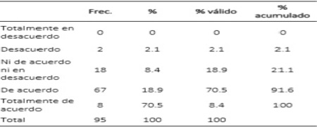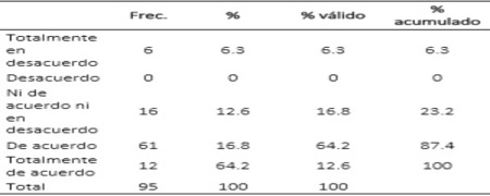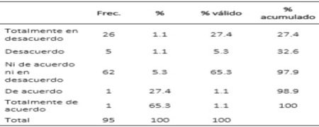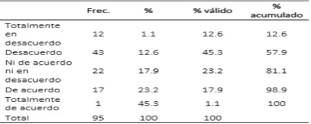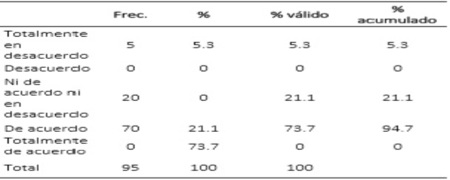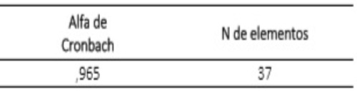 Estadístico en SPSS21Los resultados de la confiabilidad del instrumento muestran que las opiniones de los clientes encuestados manifestadas en sus respuestas a los ítems del cuestionario, arrojó 0.965 en el coeficiente de Cronbach; indicando que éstas son altamente confiables.