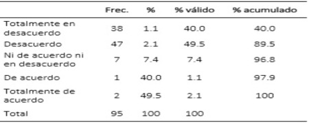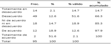 Base de Datos procesados en SPSSEn la tabla N° 2, se aprecia el equipamiento con el que cuenta la empresa taxi Perú Tours S.A.C., donde los encuestados percibieron que el 45.3% refiere estar en desacuerdo en el aspecto moderno de la empresa, y el 17.9% se mostró estar de acuerdo en el nivel de equipamiento, por lo cual existe un alto porcentaje que está en desacuerdo es decir con las unidades que cuenta la empresa Taxis Perú Tours por lo cual es preciso indicar que es necesario mejorar la flota de taxis en la empresa.