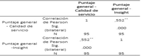 El resultado de las correlaciones de las variables Insighr y Calidad de Servicio se hizo mediante el programa estadístico SPSS 21. El mismo se muestra en la tabla adjunta: