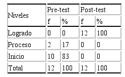 Al comparar los resultados de las evaluaciones, antes y después de aplicar la estrategia el juego libre en sectores a los niños de cuatro años de la I.E.P. “Santa Ana School” se puede apreciar que en el Pre-Test y Post-Test los puntajes obtenidos indican el avance que los niños muestran al aplicar el programa Juego libre en sectores: “Yo lo puedo lograr”. En el Pre-Test, se observó que el 83% se encuentra en nivel de inicio, demostrando poco desarrollo de su Autonomía, mientras que el 17% se encontraba en proceso. En el Post-Test, en la que se evidencia notablemente su aporte, se apreció que los niños se encontraban en el nivel logrado en un 100%, demostrando que la aplicación del programa Juego libre en sectores: “Yo lo puedo lograr” como estrategia para desarrollar la Autonomía fue significativo.