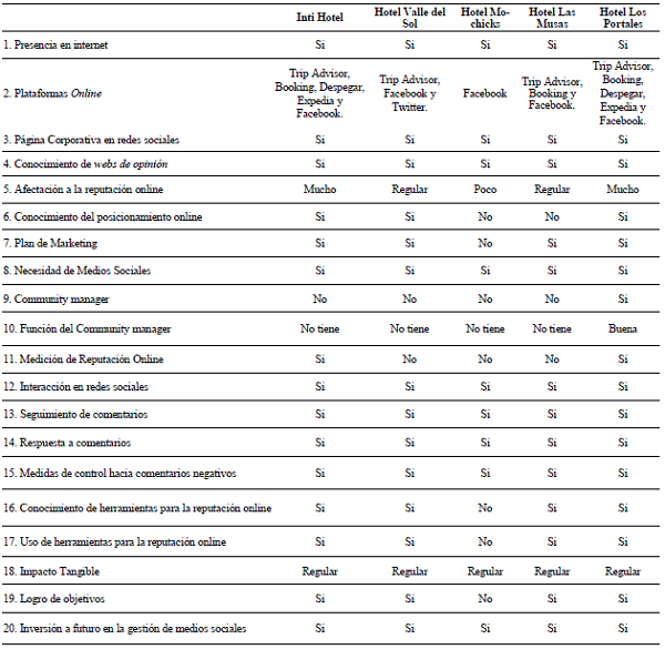 Se muestra un consolidado de las respuestas obtenidas durante la entrevista a los encargados de la gestión de medios online. Se realizaron un total de 20 preguntas basadas en reputación online, con las cuales se busca analizar el nivel de conocimiento individual sobre esta tendencia, a la vez comparar la presencia que asume cada establecimiento en la web, así como la importancia que se atribuye a un plan de control asentado en las opiniones obtenidas en las plataformas online en las que se encuentran.