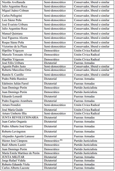 En este artículo entendemos a los gobiernos y a sus titulares como democráticos cuando sus titulares alcanzan el cargo a través del cumplimiento preciso de las normas y procedimientos que la Constitución Nacional y las leyes fijaban en ese entonces8. A su vez, definimos como semi-democráticos o democracias restringidas a los gobiernos cuyos titulares llegan a ocupar esa magistratura mediante procedimientos que violan algún punto importante de la normativa de la época9. Finalmente denominamos como de facto, o dictatoriales a aquellos que alcanzan el cargo mediante la violación directa y la negación explícita de los procedimientos institucionales establecidos10.