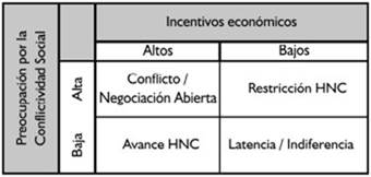 Así, frente al rechazo de las actividades extractivas existen cuatro escenarios alternativos. Primero, cuando los estados provinciales muestran alta “preocupación por la conflictividad social” y tienen bajos “incentivos económicos” para adoptar una actividad extractiva, es esperable que se avance con la prohibición o regulación estricta de la misma. Segundo, frente a un alto nivel de “preocupación por la conflictividad social” pero un elevado “incentivo económico” para explotar la actividad se inaugurará una etapa de negociación o instancia abierta que derivará, conflicto mediante, en avance o la restricción de la actividad. Tercero, en escenarios que combinan una baja “preocupación por la conflictividad social” y un alto “estímulo económico” para explotar una actividad extractiva, podemos esperar el avance de esta última. Finalmente, en contextos de baja “preocupación por la conflictividad social” y bajos “incentivos económicos” para el gobierno subnacional, esperamos que se inauguren estados de indiferencia o latencia del conflicto. El Cuadro 1 sintetiza estos escenarios.