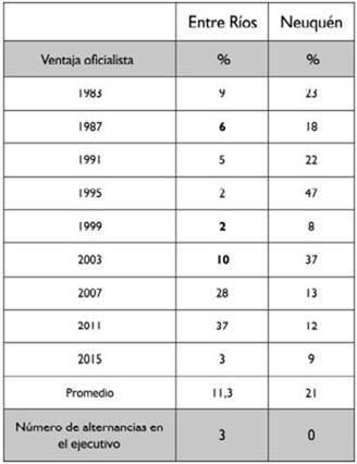 Entre Ríos evidencia una fuerte competencia electoral entre dos fuerzas políticas: el Partido Justicialista (PJ) y la Unión Cívica Radical (UCR). Dicha disputa por cargos ejecutivos y legislativos se dio con mayor intensidad entre 1983 y 2003, cuando aún se mantenía vigente la Constitución de 1933 que impedía la reelección del ejecutivo. Durante este período se sucedieron tres alternancias y superándose por escasos márgenes de votos. No obstante, a partir de 2003 el declinar electoral de la UCR fue constante y permitió al PJ afianzarse e impulsar la reforma constitucional de 2008 que posibilitó la reelección del gobernador por segundo mandato. Contrariamente, el sistema político neuquino refleja la fortaleza del Movimiento Popular Neuquino (MPN), el cual triunfó en la totalidad de las 11 elecciones provinciales y abandonando el poder sólo en períodos de facto. Esto implica la ausencia de alternancia del ejecutivo, una amplia y constante ventaja oficialista y una escasa competencia extrapartidaria (Polischuk y Quayaq, 2013). La Tabla 1 recupera las ventajas oficialistas en las provincias analizadas.