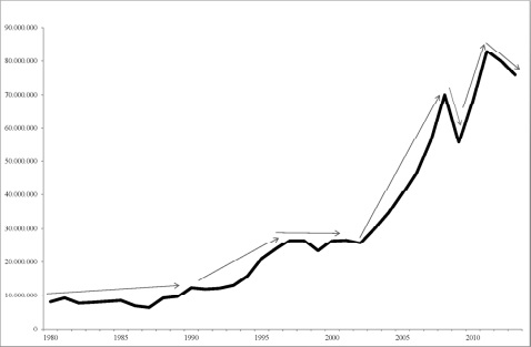 En una mirada de más largo plazo, las exportaciones argentinas tendieron a crecer desde la década de 1980, todavía lentamente, hasta la primera década del siglo XXI, sin embargo, tal crecimiento no estuvo exento de fluctuaciones y, por consiguiente, hubo años de estancamiento y de caída (Gráfico 1). De acuerdo con los datos actualizados del INDEC, en el siglo XXI, el crecimiento de las exportaciones se explica por el incremento de los precios -desde 2003 hasta 2012, menos en 2009-, cuyos niveles casi duplicaron los de la década de 1990, y el incremento de cantidades, aunque este indicador ya exhibía un comportamiento más estable desde el último decenio del siglo anterior y tuvo un desempeño menos espectacular que los precios.