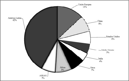 Acerca de la distribución geográfica, Argentina ha tenido un esquema variado (OMC 2013). Considerados individualmente, en 2013 el principal destino fue Brasil (21%), seguido por China (8%), Estados Unidos (6%), Chile (5%) y la India (4%). Es decir, los primeros cinco destinos no sumaron siquiera la mitad de las exportaciones y la mayoría de los destinos, diseminados por distintos continentes, no compraron separadamente más del 2% del valor total exportado (Gráfico 2).