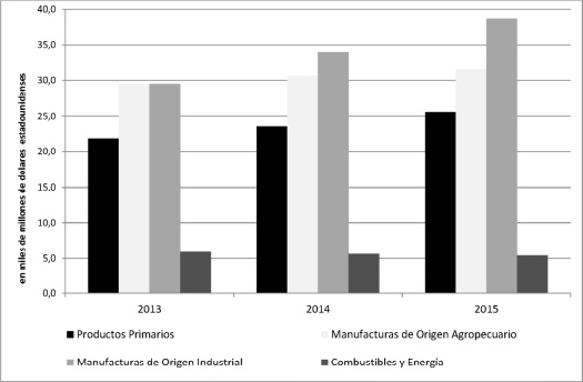 Entre 2010 y 2013, el 34,4% del valor exportado se compuso de Manufacturas de Origen Industrial (MOI), el 33,9% por Manufacturas de Origen Agropecuario (MOA), el 23,3% de Productos Primarios (PP) y el 8,4% de Combustibles y Energía (CyE)3. Con una mirada retrospectiva, es posible observar un incremento de las MOI y descenso de CyE -provocando una “reprimarización” más moderada que en otros países latinoamericanos (Gerchunoff y Kacef 2016)-, pero, en la composición de la canasta, los años kirchneristas fueron poco rupturistas en relación con la década de 1990. Entre las exportaciones industriales predominaron aquellas de menor contenido tecnológico (Porta, Fernandez Bugna y Moldovan 2009; Tussie y Nemiña 2012, Bouzas y Pagnotta 2003, Bouzas 2007), y dos tercios del valor total exportado se concentraron en cinco complejos exportadores de bienes entre 2010 y 2013, a saber: oleaginoso (25,5%), automotriz (12,6%), cerealero (10,9%), petrolero-petroquímico (9,5%) y bovino (4,7%).