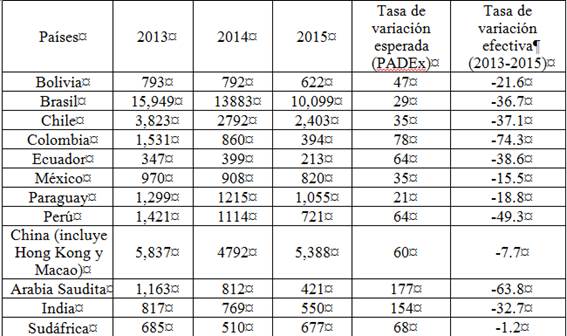 En cuanto a los veinticuatro destinos prioritarios, calculamos las tasas de variación para aquellos países para los que conseguimos información y confirmamos que las ventas no se incrementaron en la medida esperada, sino que decrecieron significativamente, incluso en aquellos que componían el Componente II y que apelaban a profundizar el proceso de regionalización. No obstante, cabe aclarar que el año 2014 mostró un mejor desempeño que 2015, tenido como parámetro de medición.