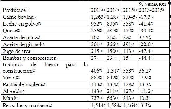 En cuanto a los productos considerados prioritarios por el PADEx, hemos calculado, para algunos casos, su trayectoria entre 2013 y 2015. Como se puede seguir, así como ocurrió con los destinos, 2014 tuvo mejor desempeño en comparación con 2015.