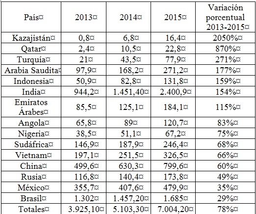 El Componente I buscó incrementar de manera rápida y sostenida las ventas argentinas al exterior hacia destinos seleccionados por su gran tamaño y/o el dinamismo de su mercado interno, teniendo en cuenta su coeficiente y crecimiento importador en los últimos años (para conocer la metodología de selección, véase Apéndice A). Los países seleccionados fueron: Kazajistán, Qatar, Turquía, Arabia Saudita, Indonesia, India, Emiratos Árabes, Angola, Nigeria, Sudáfrica, Vietnam, China, Rusia, México y Brasil. Notamos que la variación porcentual esperada fue mayor con economías de alto crecimiento, pero la diferencia absoluta entre el año 2013 y 2015 era mayor con las potencias medias, con las que ya existía un importante intercambio.
