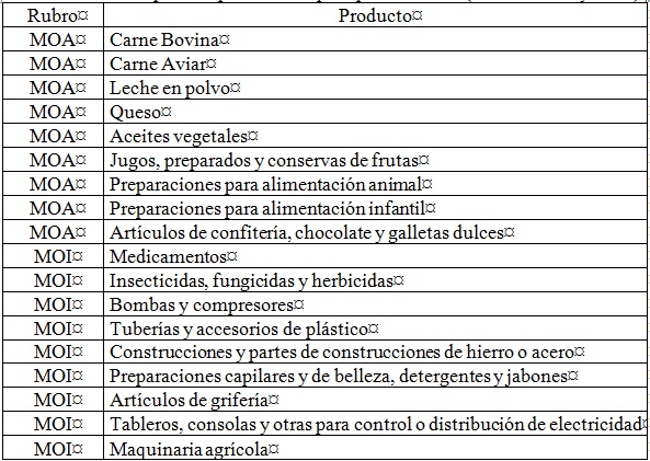 7.CHINA: Alimentos y Bebidas (Lácteos, Pescado); Alimento balanceado para animales; Tabaco; Legumbres y Hortalizas; Bienes de Capital; Medicamentos; Autopartes.