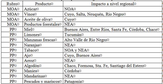 Los principales PPs y MOAs regionales a ser promocionados por el PADEx fueron: