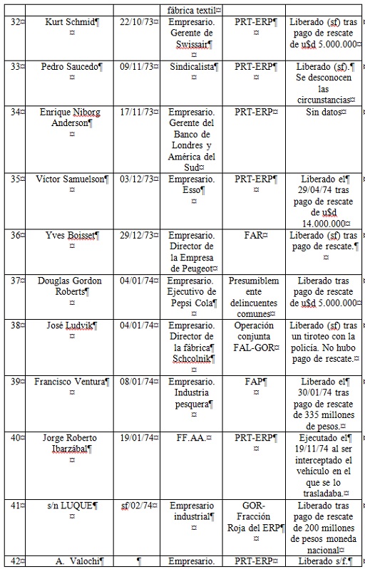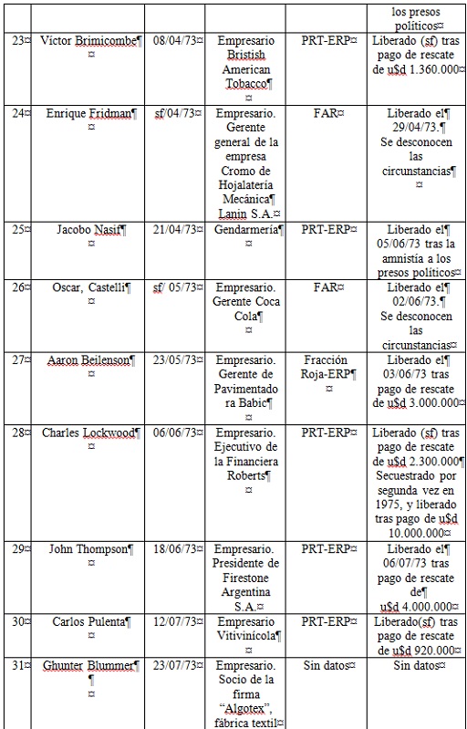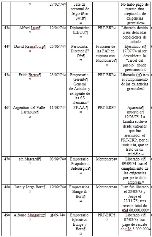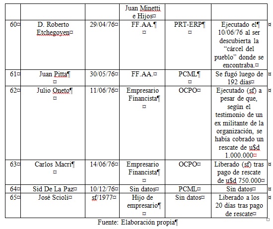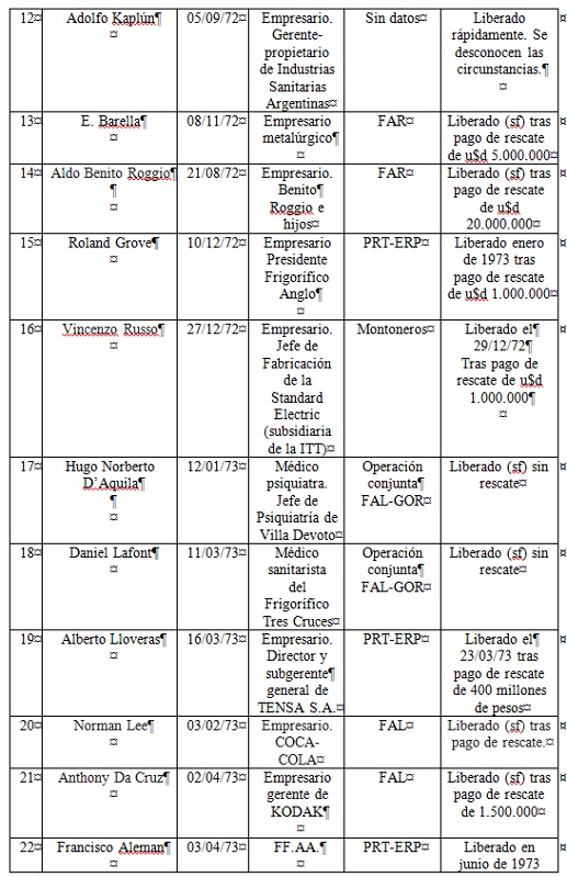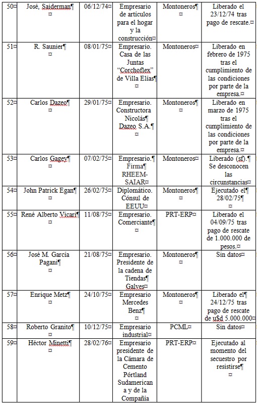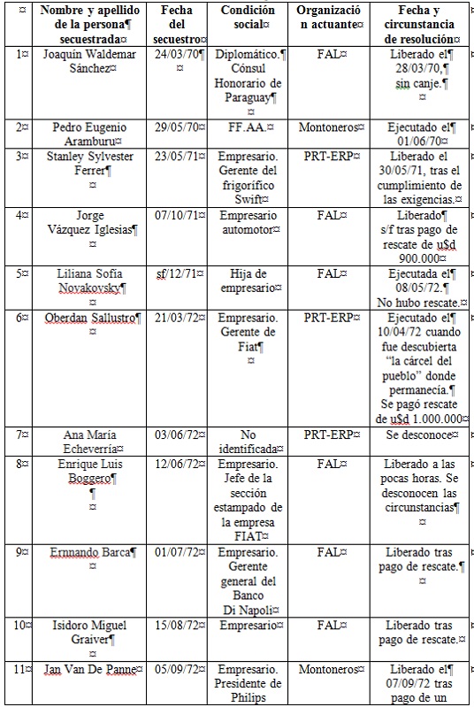 A continuación se presenta un cuadro con el relevamiento confeccionado durante la investigación y considerado en el presente artículo. Se han numerado los casos siguiendo un orden cronológico. Para cada uno, se consigna nombre y apellido de la persona secuestrada; fecha de secuestro; condición social; organización actuante; fecha y circunstancias de la resolución del secuestro.