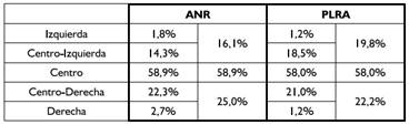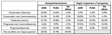 Sin embrago, como ya señalamos en la sección anterior, evaluando los datos generales del posicionamiento ideológico efectivo (basado en las preguntas clave), las respuestas proporcionadas por los afiliados determinan un cambio radical en su posicionamiento; sobre todo en el caso de los afiliados a la ANR. Así, vemos que, en la ANR, además de primar las posiciones moderadas, crecen paulatinamente los afiliados con posiciones de centroizquierda (llegando hasta 19,3%), mientras que bajan de manera abrupta los afiliados con posiciones de derecha (disminuyendo su porcentaje hasta 3,9%). Lo mismo ocurre en el caso de los afiliados al PLRA, con un importante incremento de las posiciones centristas respecto a los datos del auto posicionamiento, y un incremento de los afiliados con posiciones de centroizquierda (que crece hasta un 23,4%) a expensas de aquéllos con posiciones de derecha (que se reducen hasta un mínimo 1,4%), aunque la diferencia es mucho menos marcada que aquélla registrada en la ANR.