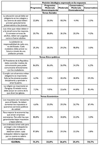 En la Tabla 2 se puede apreciar cómo las respuestas de los encuestados a cada una de las preguntas se distribuyen entre diferentes posiciones ideológicas. Al respecto, es interesante evidenciar la extrema variabilidad ideológica de las respuestas que se registran entre pregunta y pregunta, con algunas que presentan posiciones muy progresistas (de izquierda) y otras muy conservadoras (de derecha). Se trata éste de un dato que podría resultar sorprendente, pero que en realidad resulta lógico al considerar la ausencia de un verdadero debate ideológico en el país, cuyo resultado ha sido una baja cultura política en la población, dejando al elector sin posibilidad de poder construir una visión política coherente. De esta manera, se observa cómo los conceptos conservadores impuestos por las élites económicas dominantes se han vuelto sentido común, al tiempo que algunas nuevas ideas que llegan a través de la cada vez mayor integración del Paraguay al resto del mundo crean en muchos electores opiniones contrapuestas entre sí que, en ausencia de un medio que informe a partir de debates de fondo, permite que las personas expresen ideas contradictorias.