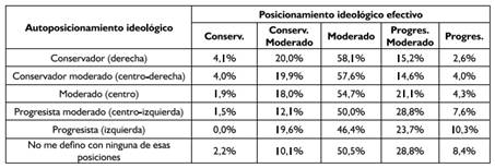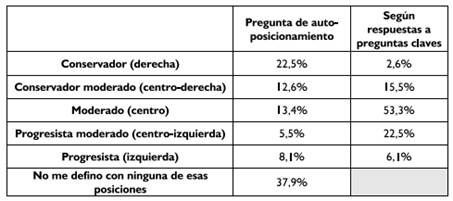 Pero lo más llamativo en esta tabla es sin duda la notable diferencia entre los resultados del auto posicionamiento ideológico y del posicionamiento obtenido a través de las preguntas clave. En este sentido, con los resultados arrojados por las preguntas clave crece de manera importante la cantidad de electores moderados (53,3%), aumentando también las posiciones intermedias de centroizquierda (22,5%) y de centroderecha (15,5%); mientras que las posiciones más extremas se reducen. Al respecto, la incidencia de la izquierda disminuye muy poco (pasando del 8,1% al 6,1%), mientras que la reducción de la derecha se da de manera abrupta (pasando del 22,5% al 2,6%). Lo que ocurre entonces no es solamente una redistribución del posicionamiento ideológico debido al casi 40% de electores que en el auto posicionamiento declaró no identificarse con ninguna ideología, sino que hay también una importante reducción del espacio conservador, ya que el auto posicionamiento no resiste a la prueba de la visión ideológica a través de preguntas clave.