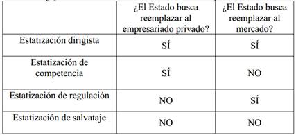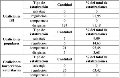 Como se puede ver en esta breve enumeración, varios tipos de estatización coexistieron bajo mismos gobiernos y coaliciones sectoriales; no obstante, uno de esos tipos fue predominante bajo cada una de las cuatro coaliciones posibles, tal como sostiene la hipótesis de este trabajo, y cómo podemos ver en la Tabla 3.