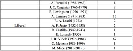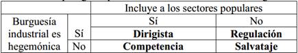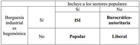 Siguiendo a Collier y Levitsky (1998) conceptualizó a cada coalición sectorial a partir de los atributos de mis dimensiones que se encuentren presentes. Si en la coalición están presentes las organizaciones de los sectores populares y la burguesía industrial, la misma es conceptualizada como “ISI” (Industrialización por Sustitución de Importaciones), siguiendo el concepto de “actores ISI internos” de Etchemendy (2015), con el que denomina al agrupamiento entre sindicatos e industriales protegidos por el Estado. Si en la coalición están presentes las organizaciones de los sectores populares, pero no la burguesía industrial, la misma es conceptualizada como “popular”, enfatizando solamente su carácter inclusivo. Si en la coalición están presentes los industriales, pero no los sectores populares, la misma es conceptualizada como “burocrática-autoritaria”, siguiendo el concepto de O’Donnell (1972, 1982), con el que denomina al régimen de exclusión autoritaria o desactivación de los sectores populares conducido por las burocracias de la industria y del Estado. Si en la coalición no están presentes ni los sectores populares ni la burguesía industrial, la misma es conceptualizada como “liberal”, en tanto que este concepto expresa con claridad la no-regulación (y también la des-regulación) de los mercados, y hace manifiesta la desvinculación del gobierno respecto de los sectores industriales y populares.