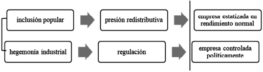 Como vemos en la Gráfico 1, la inclusión de los sectores populares genera presión redistributiva, y con esa presión a cuestas, las elites observan el campo de recursos explotables a su alrededor, en el que se destacan las empresas que producen ganancias, entre otras políticas redistributivas que también son adoptadas. La participación de los industriales genera demandas de regulación, y con esas demandas a cuestas, las elites observan el campo de recursos explotables a su alrededor, en el que se destacan las empresas útiles para un control más completo de los mercados, entre otras políticas regulatorias que también son adoptadas. Así, esta teoría no predice cuándo va a ocurrir una estatización, sino que predice cuáles serán los beneficios políticos que las empresas reportarán, una vez en manos del Estado, a las diferentes configuraciones coalicionales.