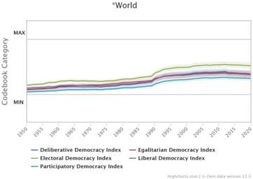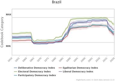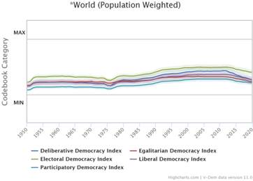 Hoy, un cuarto de siglo después de la publicación de esta obra, la realidad es muy distinta, el índice de V-Dem prácticamente no se ha movido alcanzando un valor de 0,406, apenas un 5% superior al de 1996. Aún más, si tomamos los indicadores globales que se ponderan por la cantidad de población este indicador desciende de 0,378 en 1996 a 0,324 en la actualidad reflejando el deterioro democrático que sufren algunas de las democracias más pobladas del mundo como la India (de 0,602 a 0,32), los Estados Unidos (de 0,774 a 0,662) y Brasil (de 0,708 a 0,474) tal como podemos observar en los gráficos 2, 6, 5 y 4 respectivamente.