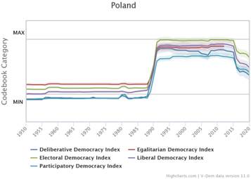 Pasando de los procesos latinoamericanos a Europa del Este el patrón que siguió Polonia es casi calcado al de Brasil, casi veinticinco años de índices muy altos seguidos de una abrupta caída que nos habla de un profundo proceso de autocratización. Un proceso similar puede detectarse en otro país postcomunista, Hungría, salvo que en este caso la autocratización comenzó un poco antes.