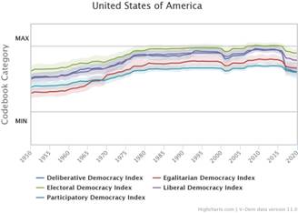 Estados Unidos prácticamente no había experimentado un retroceso en sus indicadores democráticos con excepción de las restricciones que implicaron los atentados del 11 de septiembre del 2001, sin embargo, desde el 2016 la caída es marcada. Seguramente la derrota de Trump y la presidencia de Biden cambiarán la situación, pero eso no nos tiene que hacer olvidar lo cerca que se encontró el país en los meses del proceso electoral y de la proclamación del nuevo presidente de una caída aún más notable y de consecuencias imprevisibles. Un resultado electoral algo más parejo en dos o tres estados probablemente hubiera conducido a una situación sin retorno.