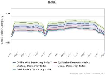 La India, la mayor democracia del mundo, había experimentado un proceso de autocratización a mediados de la década de 1970 en el llamado periodo de emergencia (Mechkova y Lindberg 2016) pero desde entonces los indicadores mostraron avances, módicos, pero avances al fin. No obstante, los últimos años la caída ha sido tan abrupta que para el Proyecto V-Dem pasó a ser catalogada como una autocracia electoral, es decir dejó de ser considerada una democracia (Alizada et al. 2021)