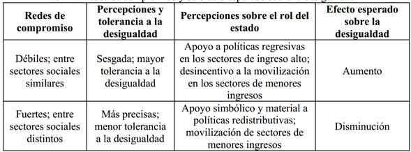 De forma contraria, cuando no existe una ciudadanía activa, los sectores más ricos subestiman los problemas que atraviesan los sectores de menores ingresos y los reducen a situaciones puntuales atribuibles al esfuerzo personal, más que a las posibilidades reales de acceder a determinados recursos y oportunidades. Esta percepción sesgada de la desigualdad tiende a llevarlos a apoyar políticas más regresivas. A su vez, los sectores más bajos tienden a subestimar la desigualdad y los efectos que las políticas redistributivas pueden tener en sus vidas y, por lo tanto, tienen menos incentivos para la movilización. Por otro lado, la falta de contacto con los sectores más ricos dificulta su acceso a recursos (económicos, sociales y políticos) que están su poder (Ver Tabla 1).