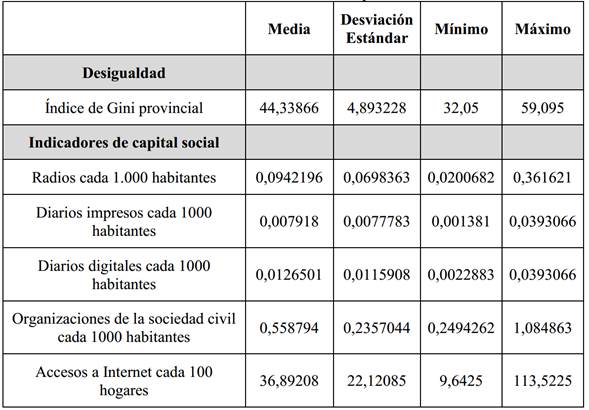 Para estimar el nivel de organización de cada provincia, se calculó la cantidad de organizaciones por persona a partir de los datos de población obtenidos del Instituto Nacional de Estadísticas y Censos. Para los diarios y las radios, se obtuvieron datos de la cantidad por provincia del Sistema de Información Cultural de la Argentina, correspondientes a 2013. Se calculó la cantidad de medios gráficos y radiales por persona a partir de los datos de población ya mencionados. Un cuarto indicador incluido en el trabajo es la cantidad de conexiones a internet, utilizado en la literatura más reciente sobre el tema (González-Reyes 2009, Pino Ibáñez 2013). Estos datos fueron obtenidos del Ente Nacional de Comunicaciones y corresponden a 2014.