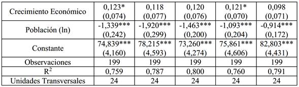 En relación a los controles y en línea con investigaciones anteriores (González y Nazareno 2019), las transferencias del gobierno federal están relacionadas negativamente con la desigualdad provincial, mientras que el empleo agrícola y el desempleo lo hacen de manera positiva. Estos coeficientes están dentro de los estándares de la significancia estadística. Por el contrario, los resultados en relación con el crecimiento económico no son concluyentes.