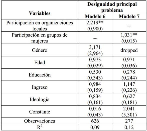 En los Modelos 6 y 7, los coeficientes principales se mueven como se esperaba y ambos son robustos y estadísticamente significativos. Las personas que participan en organizaciones locales y en grupos de mujeres tienen mayor probabilidad de percibir la desigualdad como el principal problema en la sociedad. Esto podría estar indicando que las redes de compromiso compensan las percepciones desviadas sobre la desigualdad, reduciendo la tolerancia de los ricos y los pobres hacia la misma, y pueden contribuir también a direccionar su capital social económico y político al logro de acciones redistributivas.