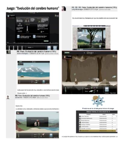 En la Imagen 1 se visualizan imágenes de la primera actividad interactiva del curso de cerebro, que correspondía al juego interactivo y auto calificable. El estudiante en este juego comenzaba con un avatar de célula, el cual al superar obstáculos ambientales, depredadores y contestar las preguntas acertadamente iba cambiando, en diferentes organismos donde interactuaba con información y preguntas de la evolución del cerebro de estos organismos, hasta llegar a los primates, homínidos y homo sapiens; el juego finalizaba con el embarazo de una (humana) Homosapiens sapiens y las explicaciones sobre neurodesarrollo fetal, un tema que ofrecido con esta interacción resultaba entendible y significativo para la mayoría de estudiantes que pertenecían a diferentes carreras por ende tenían diferentes intereses. La evaluación cualitativa era en tiempo real y el estudiante podía parar y proseguir cuando quisiera. La retroalimentación de esta actividad, así como la participación en la clase aumentaba de forma significativa (Imagen 5), la participación en el foro de discusión del tema también se evidencio en todos los cursos dinámica y con un nivel de profundidad mayor que otras actividades que no involucran lúdica.