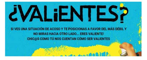 El término valiente es la palabra que forma el cuore del mensaje. Se alude a lo largo de todos los videoclips al concepto de ser valiente y a la importancia de serlo. La campaña ha logrado darle la vuelta al término y romper con la idea de valentía que se tiene desde la infancia o adolescencia donde se asocia al valiente generalmente con alguien fuerte al que todos temen. Este es uno de los objetivos principales que han conseguido, que los niños entiendan y asocien el término valiente con aquel que está dispuesto a enfrentarse al acosador, no en términos de violencia física o verbal sino denunciando, no dejando que ocurra. La idea es: "eres valiente si no miras para otro lado", como se puede observar en la siguiente imagen (Figura 3) y como realmente ha calado entre los más jóvenes.