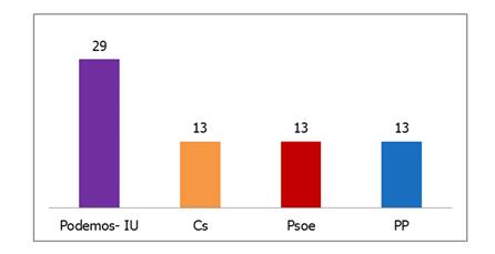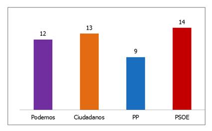 Si en las elecciones de 2015 el número de apariciones televisivas es bastante similar en todas las formaciones políticas (Ver Figura 1), durante los comicios de 2016 el partido liderado por Pablo Iglesias (Podemos) ha sido el que más presencia ha tenido en televisión, casi duplicando la de 2015, apareciendo en un total de 29 emisiones (Ver Figura 2), mientras que el resto de partidos ha mantenido una tónica similar.